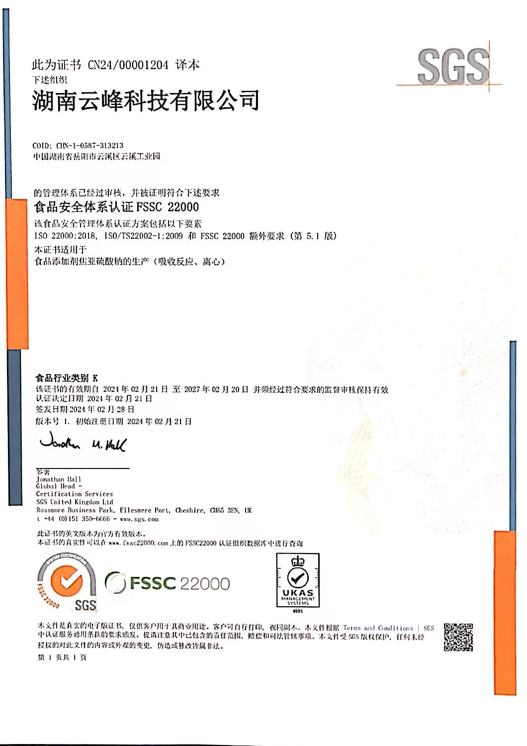 湖南云峰科技有限公司(以下簡稱云峰科技),是由長沙湘岳化工責任有限公司全額投資以生產(chǎn)焦亞硫酸鈉、亞硫酸鈉等亞硫酸鹽為主營業(yè)務的高科技企業(yè),具有六十多年的生產(chǎn)歷史,同時也是焦亞硫酸鈉的國家標準制定參與者。在行業(yè)內(nèi)具有很大的影響力。現(xiàn)有職工八十余人。具有優(yōu)良的經(jīng)營管理團隊和成熟的生產(chǎn)技術隊伍。由多位在化學、化工行業(yè)擁有豐富工作經(jīng)驗的工程師及技術員團隊組建而成,致力于亞硫酸鹽產(chǎn)品的研發(fā)、生產(chǎn)和銷售。2020年公司對生產(chǎn)設備、安環(huán)設施及工業(yè)技術等進行了大規(guī)模的升級改造,使焦亞硫酸鈉和亞硫酸鈉的生產(chǎn)工藝更加先進,技術更成熟,產(chǎn)品質量更優(yōu)良。無論在生產(chǎn)工藝、設備、產(chǎn)品質量、清潔生產(chǎn)、節(jié)能環(huán)保和員工素質方面,均處于行業(yè)領先地位。公司的主導產(chǎn)品“云峰”牌焦亞硫酸鈉,歷史悠久,深受國內(nèi)外客戶信賴,產(chǎn)品遠銷東南亞、歐美、非洲、南美洲等20多個國家和地區(qū),產(chǎn)品供不應求。